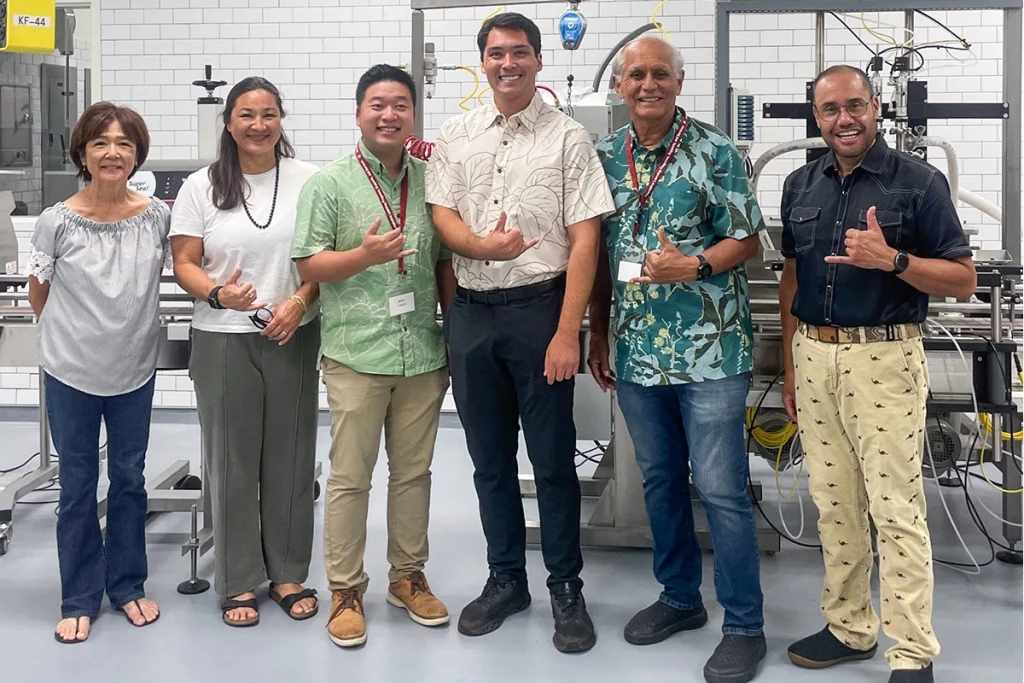 Attendees from the 2024 Alternative Program Support Services Summer Summit toured the Wahiawa Value Added Product Development Center(WVAPDC). From Left to Right: Colette Kajiwara, Coordinator, High Core/Storefront; Tia Hartsock, Director, Office of Wellness and Resilience; Bill Chen, Vice Principal, Kealakehe HS; Chris Bailey, Manager, WVAPDC; Senator Mike Gabbard; Senator Donovan Dela Cruz.
